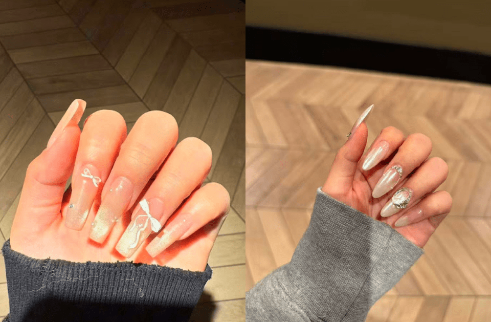 "I couldn't be happier with my nails! Kate did such an amazing job--my set came out clean, elegant, and exactly what I wanted. The nude base with the clear tips and little rhinestone details looks so classy but still has that touch of sparkle that makes them stand out. The shape is perfect, not too thick, and the finish is super smooth and glossy. The salon itself was welcoming, and the staff were friendly and attentive. They really took their time to make sure everything looked flawless, and I appreciate how detail-oriented they were. I've already gotten so many compliments on my nails--I'll definitely be coming back!"